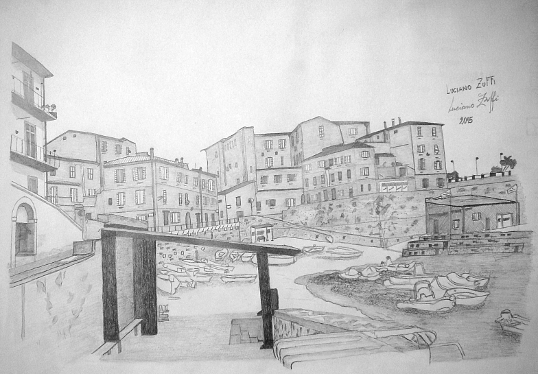Luciano Zuffi Porticciolo diMarina , disegno a matita.