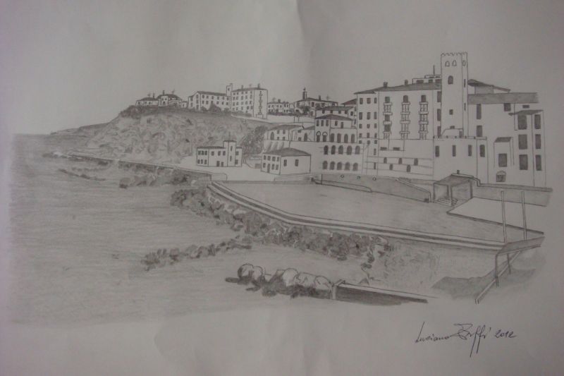 Luciano Zuffi Piombino veduta del PORTICCIOLO senza barche disegno a matita.