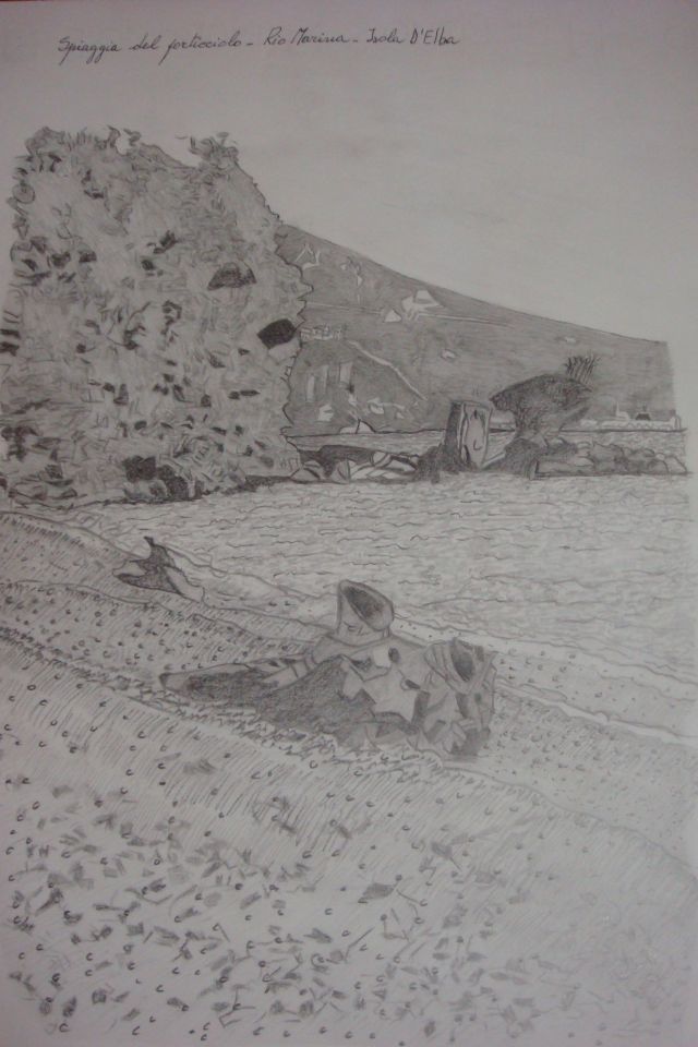 Luciano Zuffi spiaggia del porticciolo Rio Marina disegno a matita.
