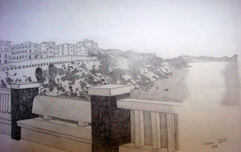 Luciano Zuffi Piombino veduta da Piazza Bovio, disegno a Matita.