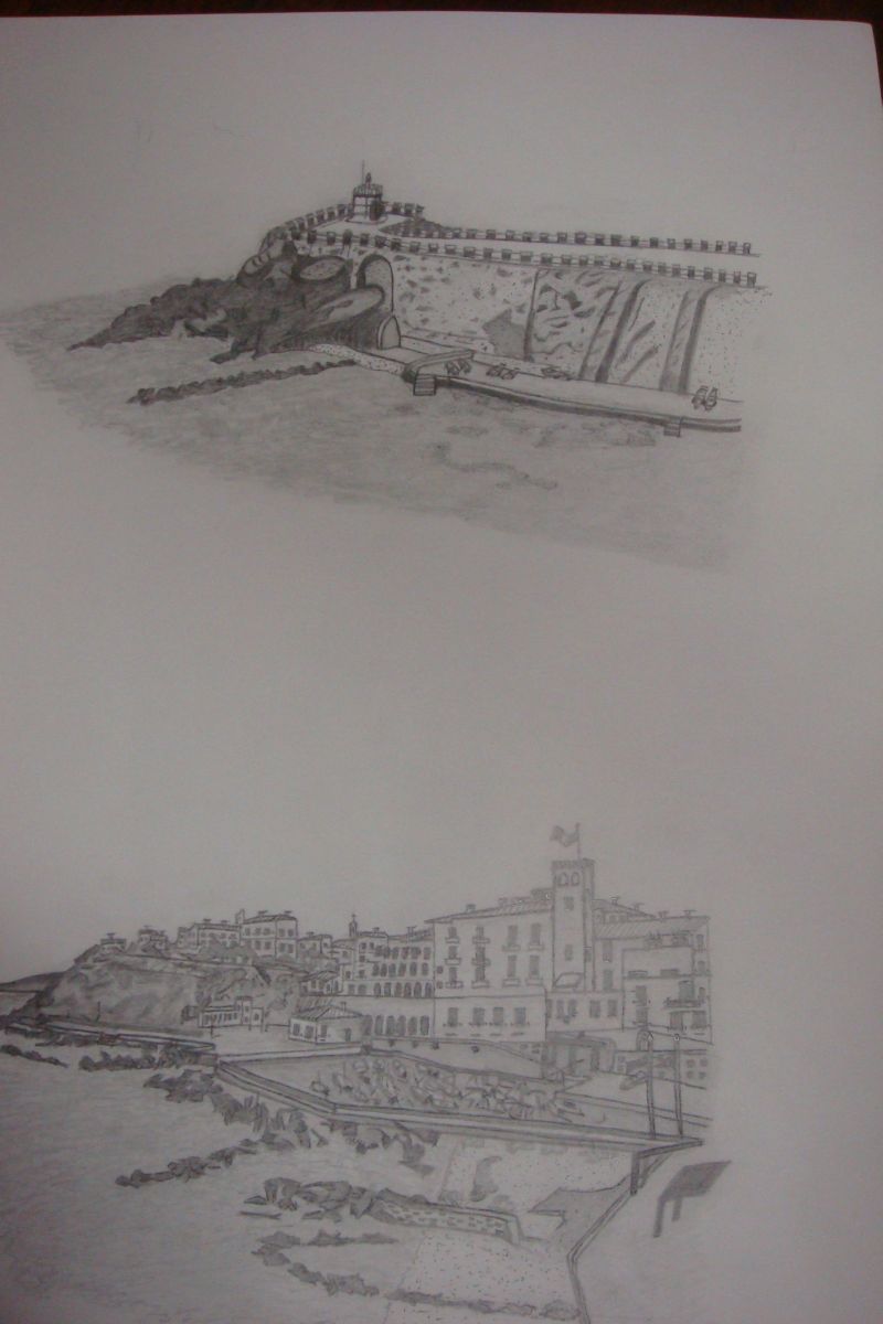 Luciano Zuffi Piombino veduta Piazza Bovio e porticciolo disegno a matita.